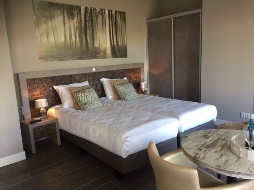 Welcome to our comfortable hotel room, ideal for a relaxing stay. Enjoy a good night's sleep on our extra-long beds with soft bedding and hypoallergenic pillows. Start your day off right with a cup of coffee or tea on your private terrace. The room has a kitchenette with refrigerator, microwave and coffee maker, giving you the option of preparing your own meals if you wish. There is also a safe, socket by the bed and wake-up service for your convenience. In short, everything you need for a comfortable stay.